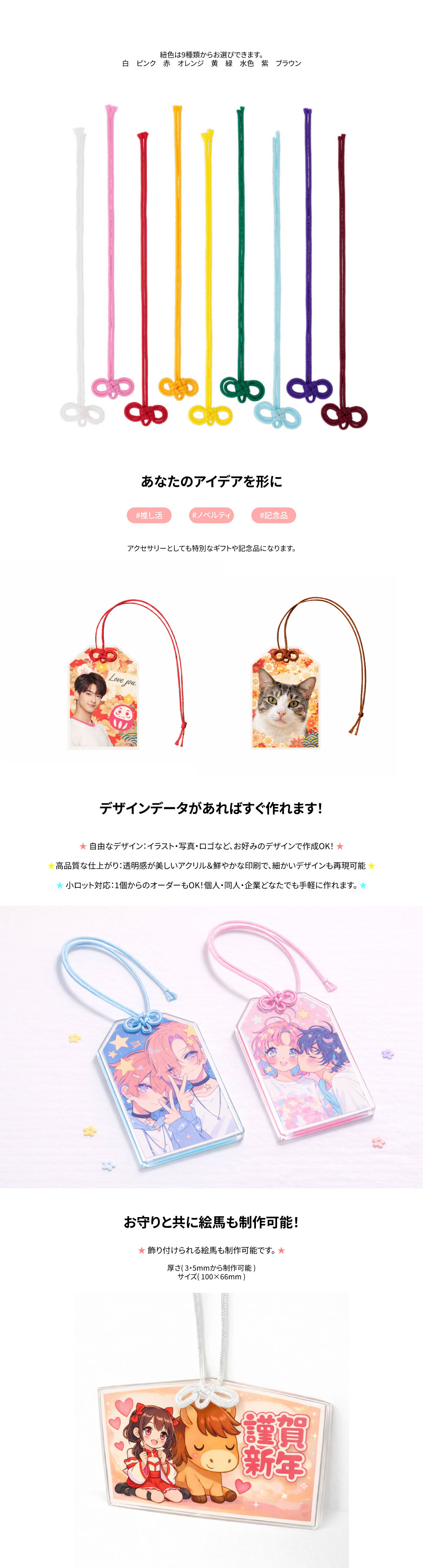 今日も、推しが守ってくれる!アクリルお守りです。透明の絵馬を作ることも可能です。 | 제품소재 | 詳細説明ページご覧 |