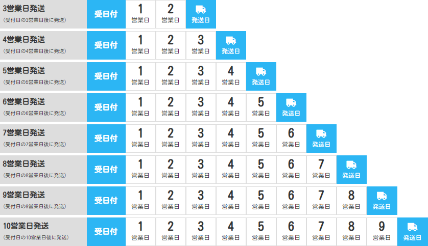 | 10営業日発送(受付日の10営業日後に発送) | 受日付 | 1営業日 | 2営業日 | 3営業日 | 4営業日 | 5営業日 | 6営業日 | 7営業日 | 8営業日 | 9営業日 | 発送日 |